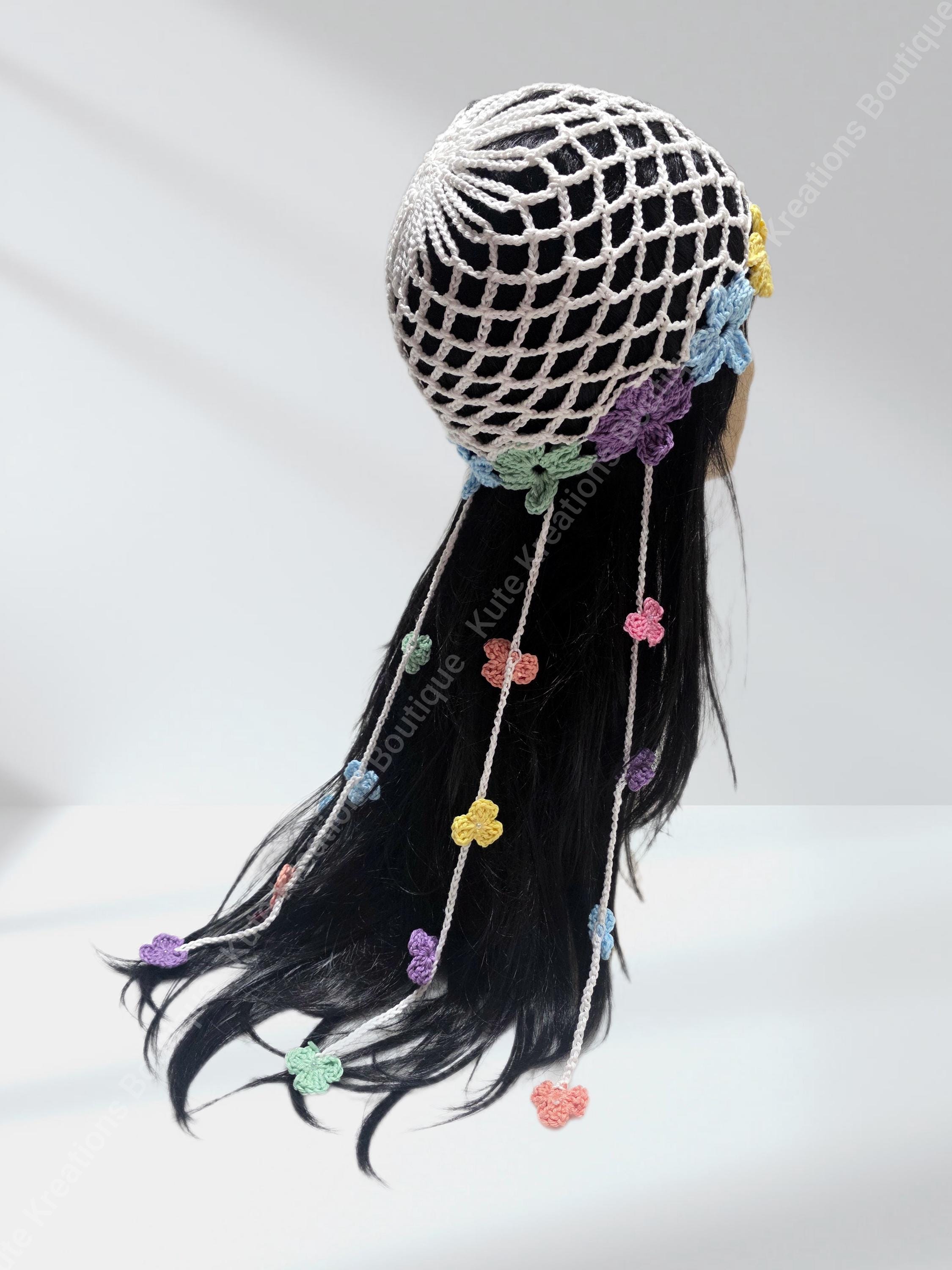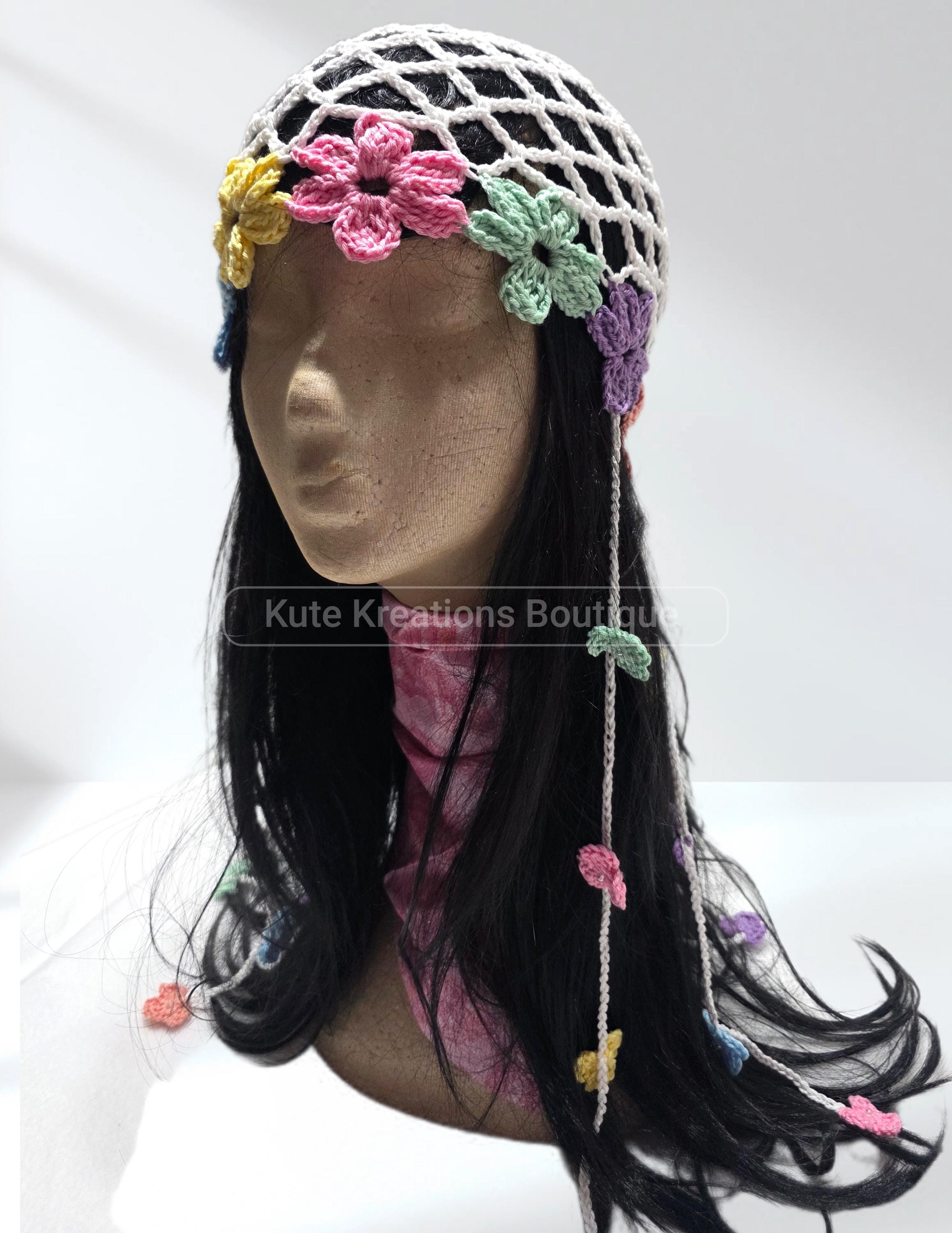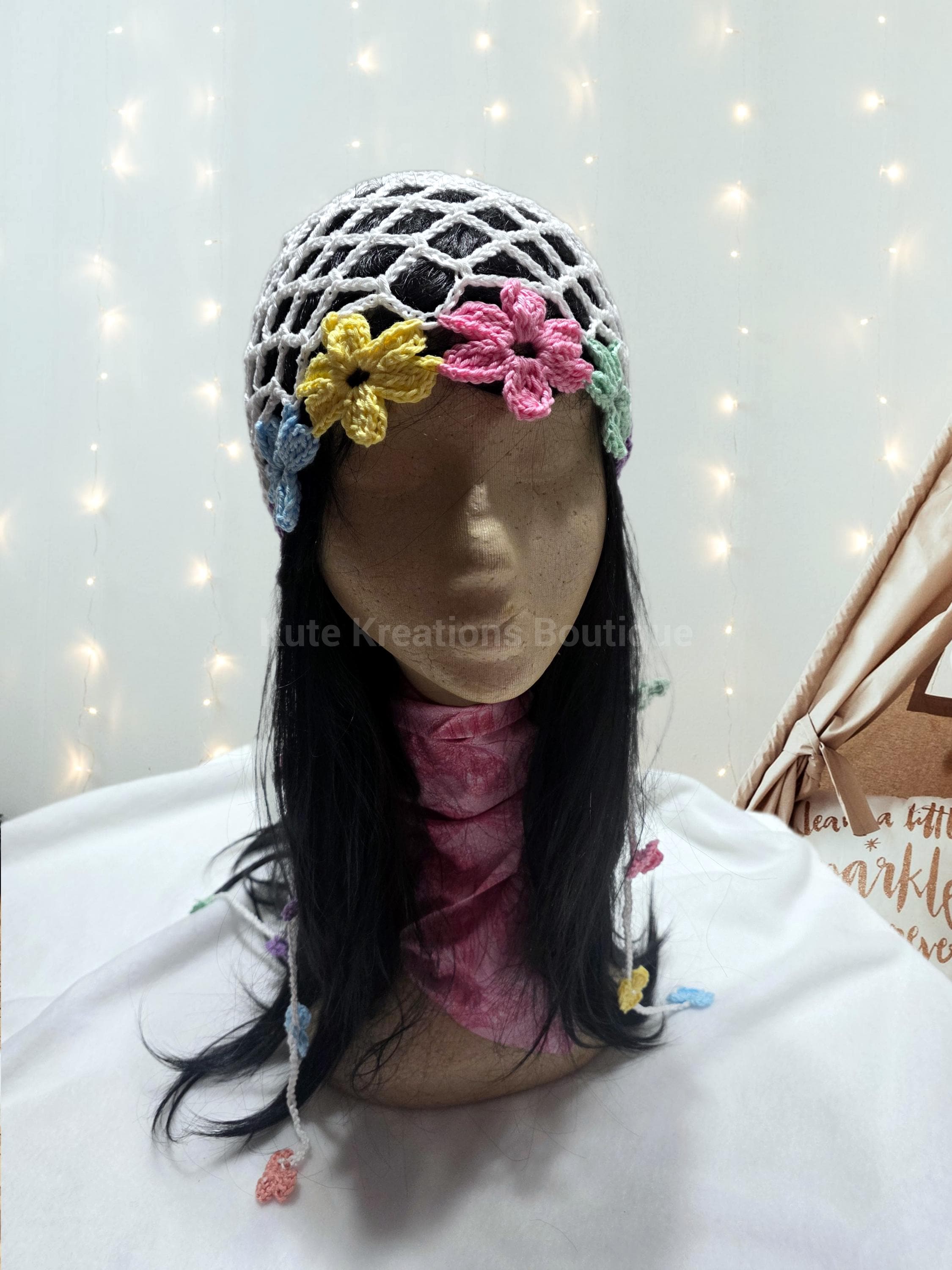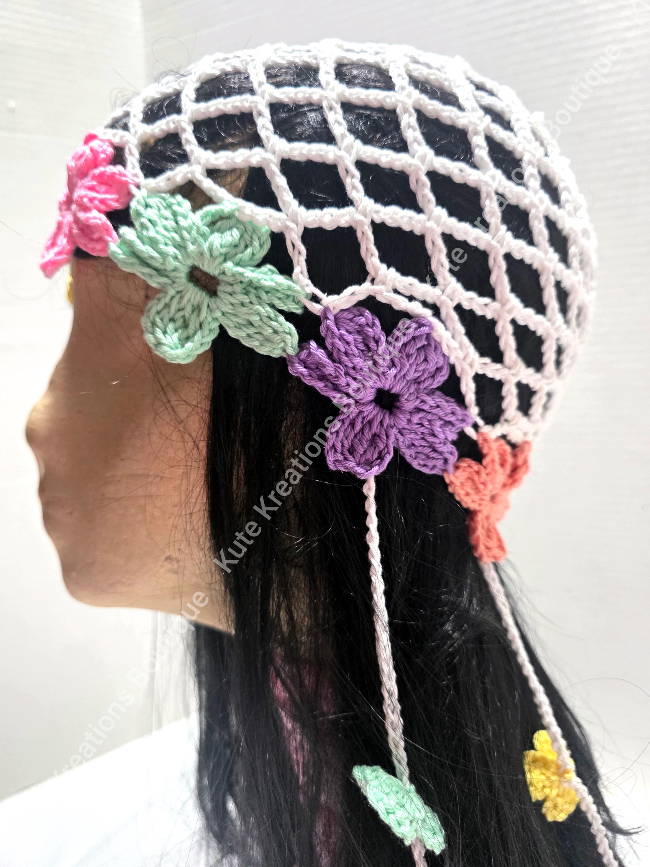Crochet Mesh hat with flowers, it comes with six strings & small flowers attached to the strings, either 4 small flowers on each string or 6 small flowers. if you prefer just the hat without the strings you choose under options "no strings"