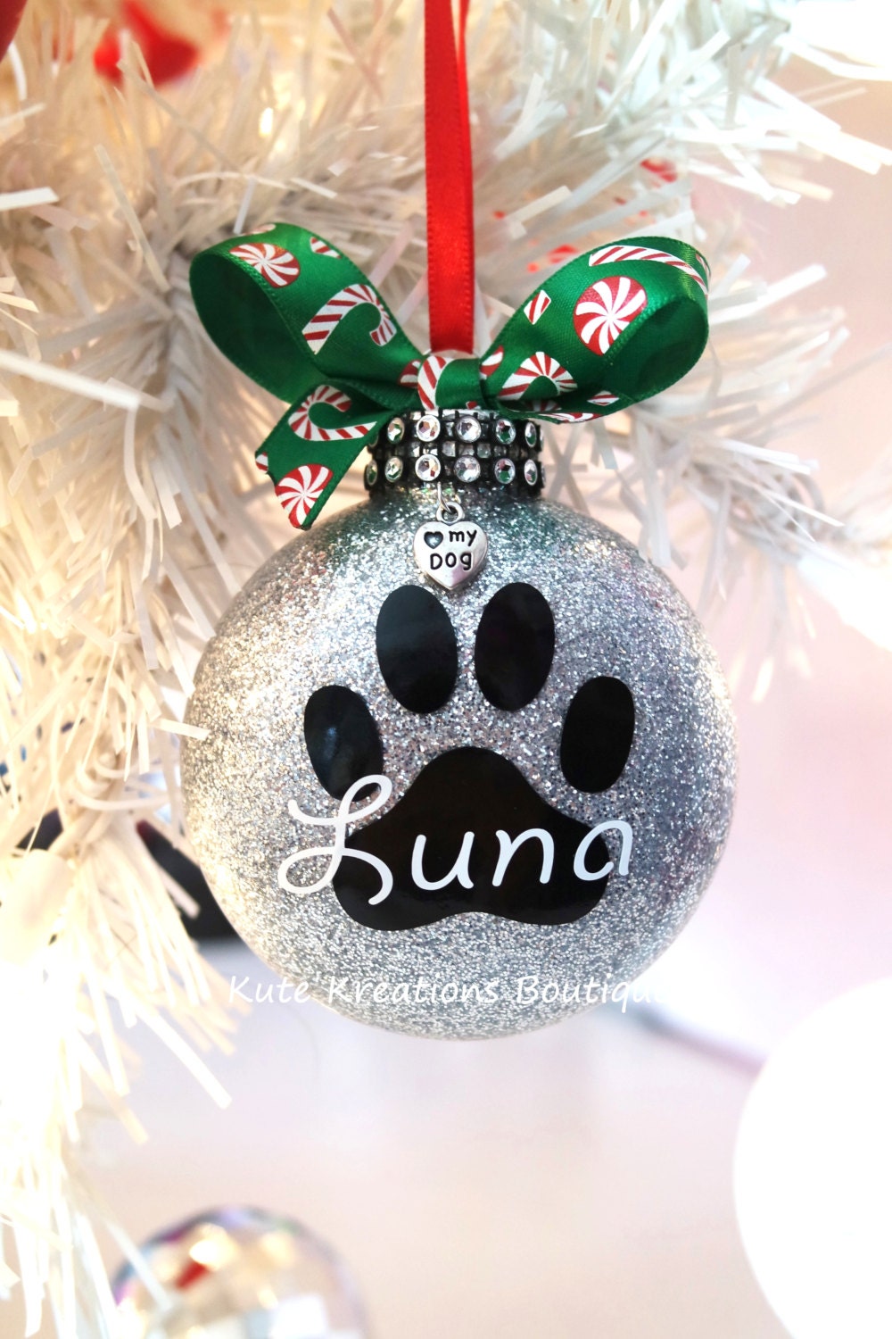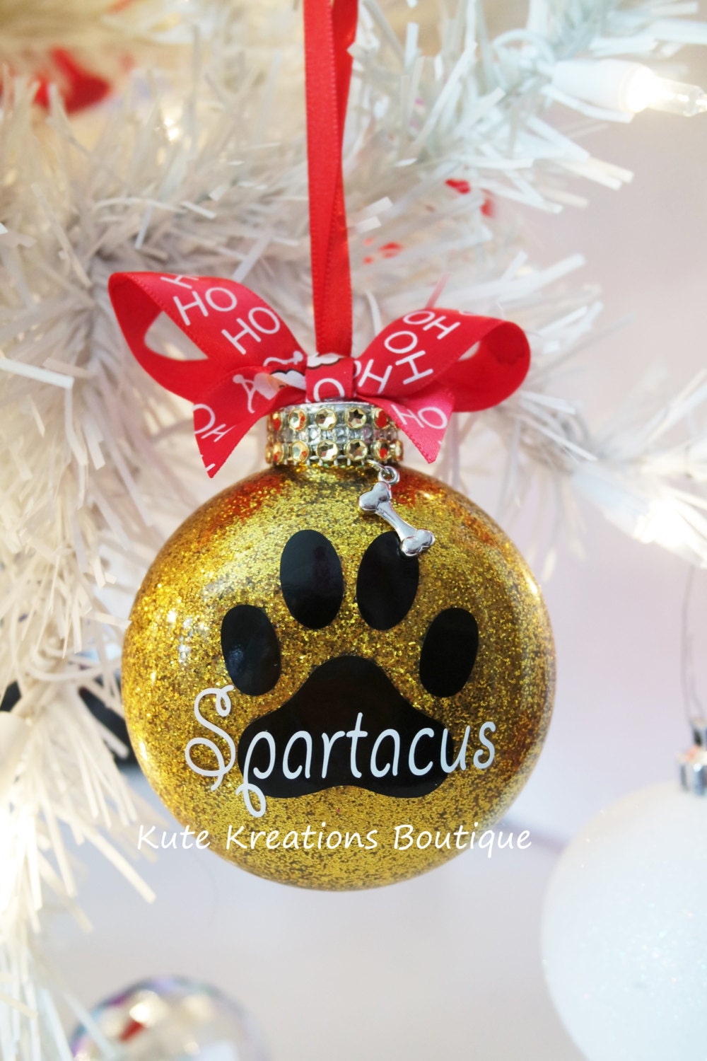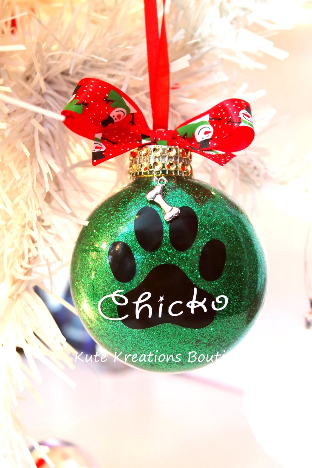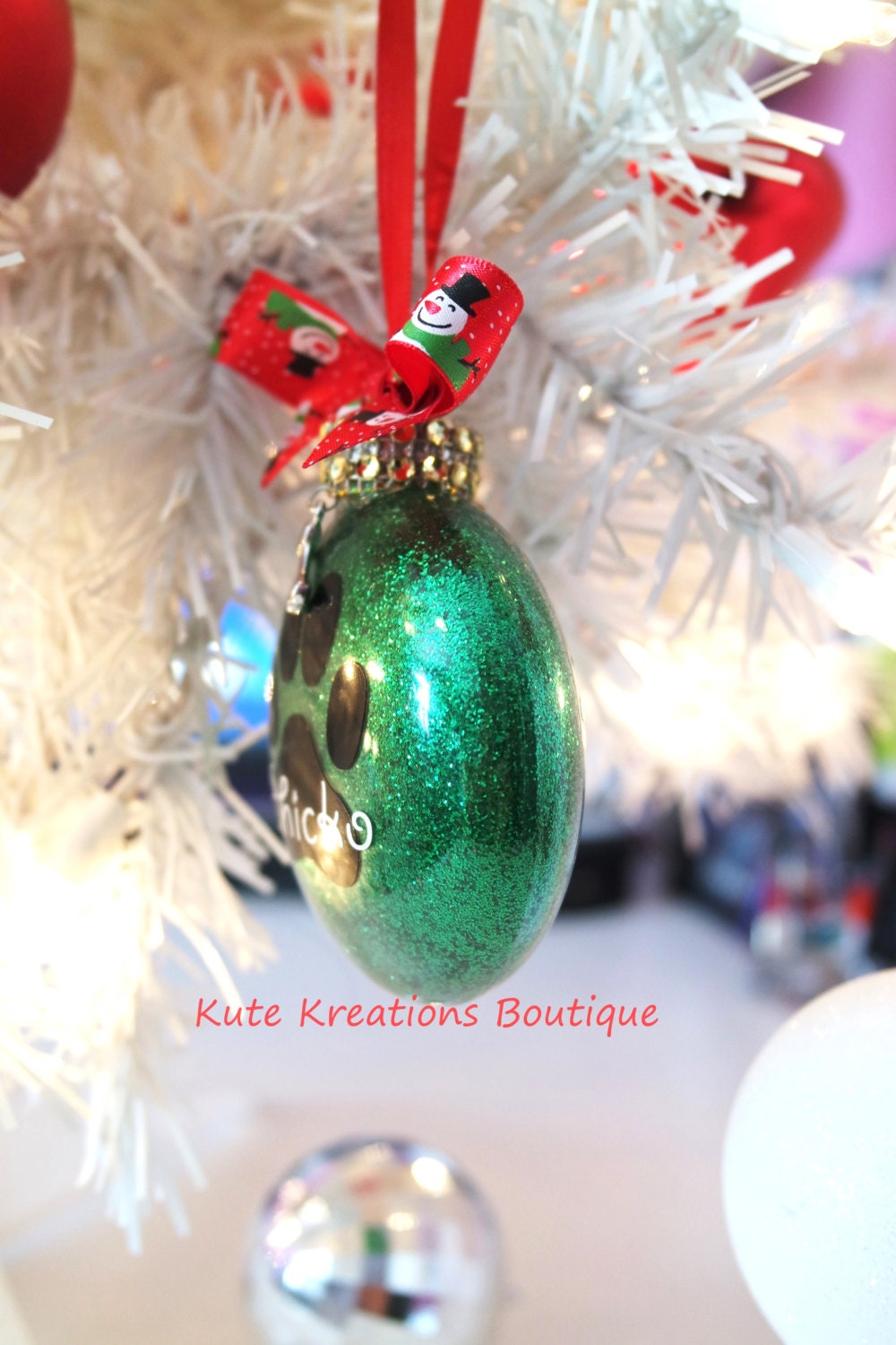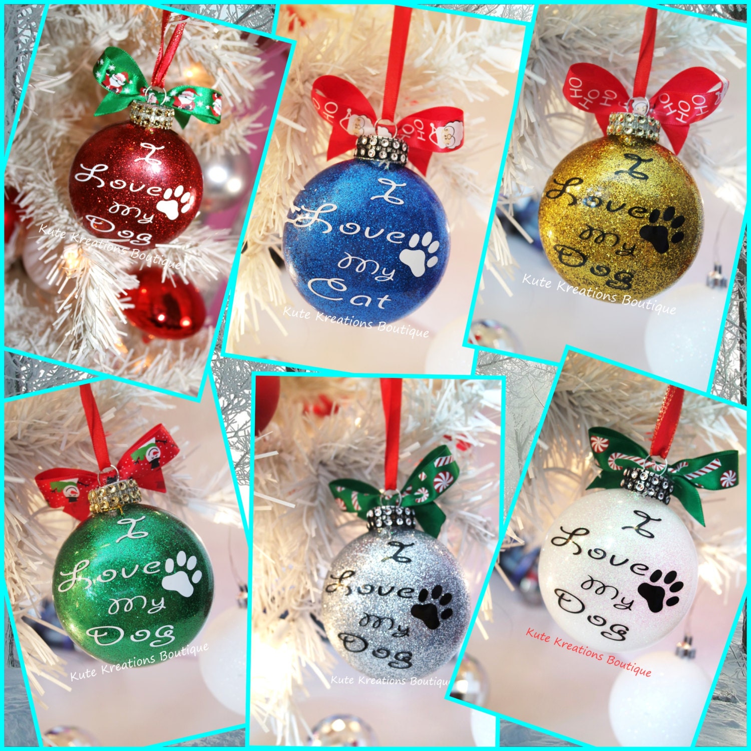 ***Flat round baubles Glass M&M Disc shape ornament decorated Paw print layered on the outside of the ornament, and on the back with " I Love my Dog or Cat"with Color sparkle glitter on the inside, Bow & small charm. Bling Ribbon glued around the base of the ornament in either Silver or Gold color, Bow is glued to the top of the ornament.